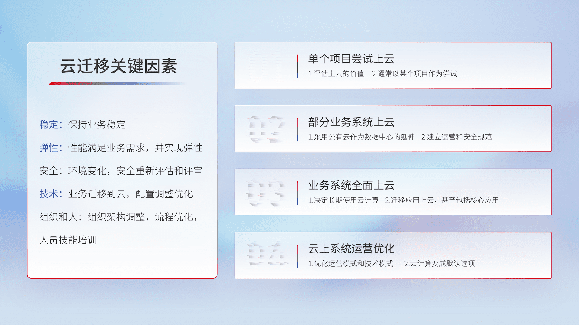 结合实际业务,,,从规划设计、、、、云平台选型、、、、云原生改造、、、数据迁移、、集成交付,,,,迁移全过程为客户识别最佳上云路径,,做好风险识别管理,,,设计网络架构、、、身份权限、、、、安全审计合规、、、操作审计、、日志审计、、、监控告警策略、、、、多站点容灾设计等,,对云上基础设施进行整体规划,,,提升IT治理水平,,,,以满足弹性、、高可用、、高性能的需求。。。。