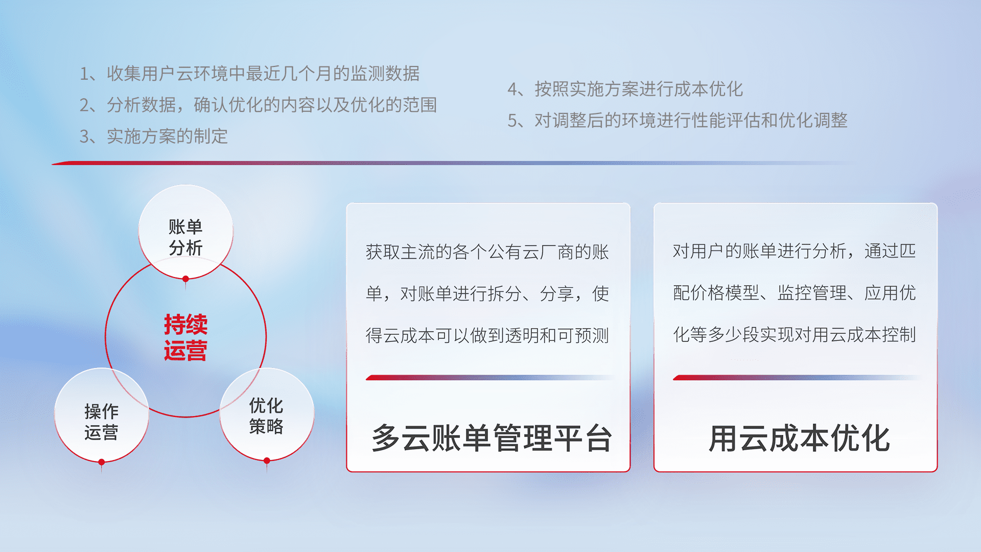 通过多云纳管,,,以统一的资源数据模型把客户的云资源进行抽象和封装,,进而实现对多云资源的统一操作,,,,保障云资源管理的可靠性、、、、稳定性与可用性。。。。量身定制化运维内容,,,,配置、、、开发运维、、、、补丁管理、、、、备份、、、监控、、认证和访问管理、、、审计和日常巡检等,,,保障在用云过程中的可靠度,,稳定度以及高可用率。。。。