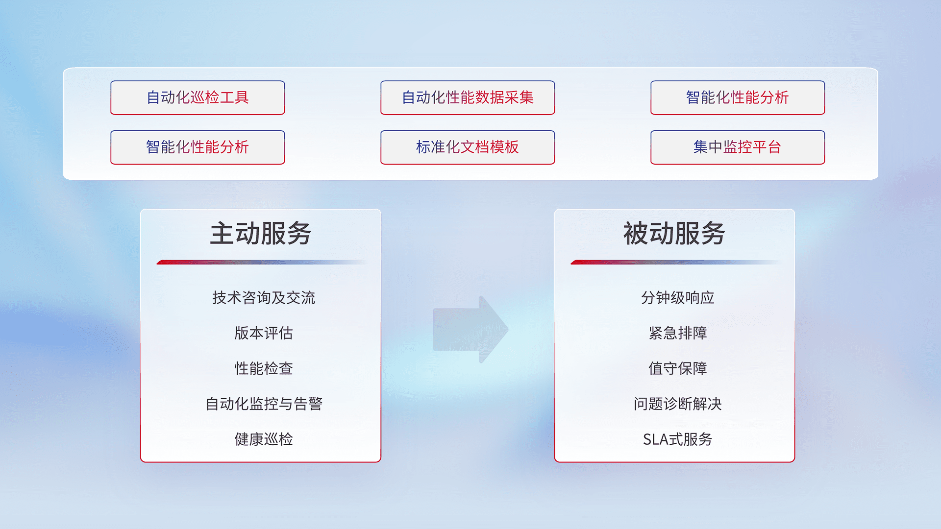 智能化工具和标准化文档,,,保障服务质量,,,,提供主动服务(包含技术咨询、、版本评估、、、、性能检查、、、、自动化监控与告警、、健康巡检)和被动服务包含(分钟级响应、、紧急排障、、、值守保障、、、问题诊断解决、、、、SLA服务)。。